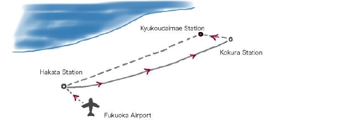 Fukuoka Airport → (Fukuoka City Subway KUKO LINE) → Hakata Station → (Transfer JR Sanyo Shinkansen) → Kokura Station → (Transfer JR Kagoshima Line) → Kyushukodaimae Station → Kyushu Institute of Technology